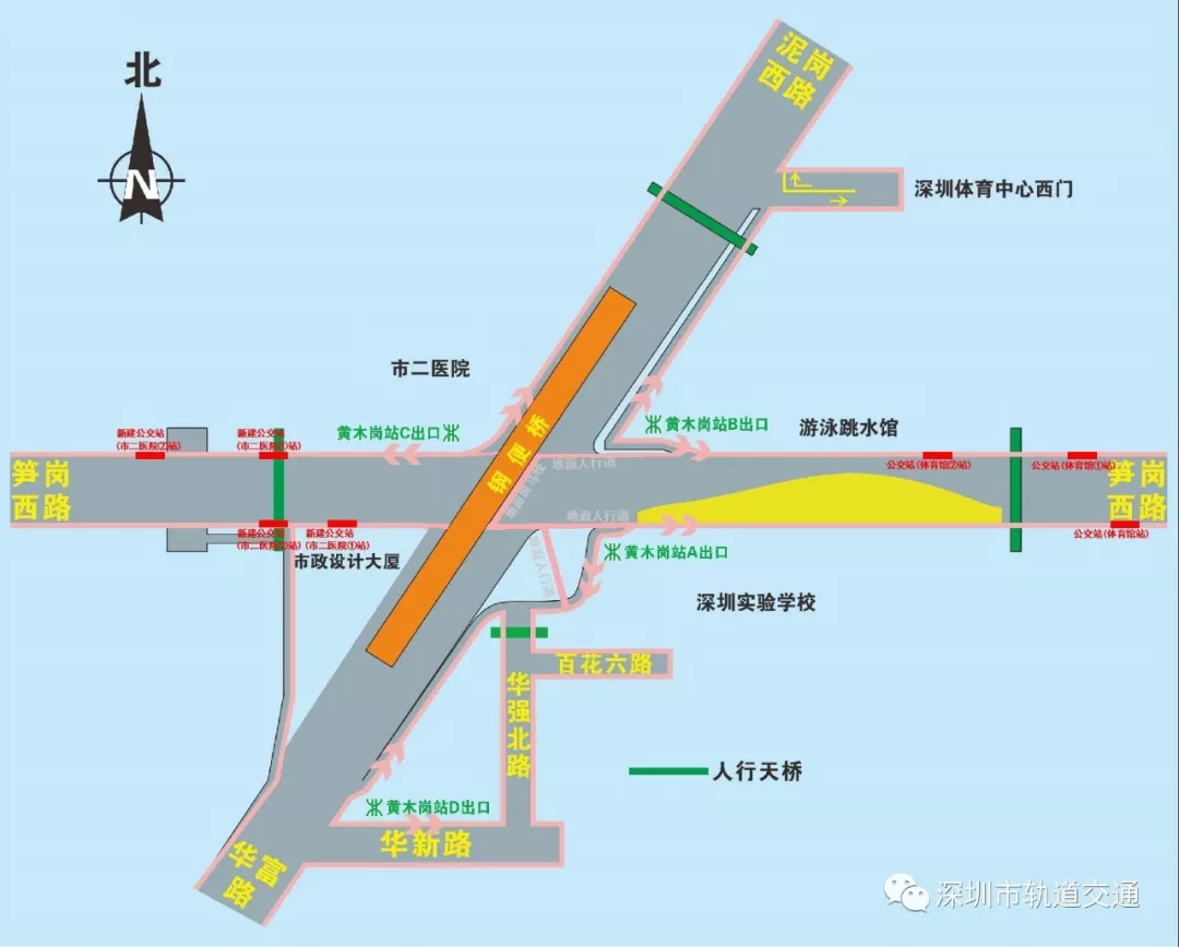 在本次調(diào)整中,華富路-泥崗西路南北向交通只能通過鋼便橋雙向六車道行車。泥崗西路、華富路、筍崗西路左轉(zhuǎn),行人線路及“市二醫(yī)院”,“體育館”公交站臺(tái)均有所調(diào)整。