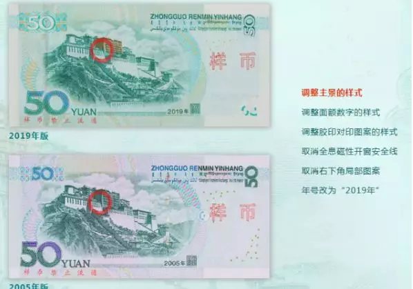 2019年版第五套人民幣50元、20元、10元、1元紙幣分別保持2005年版第五套人民幣50元、20元、10元紙幣和1999年版第五套人民幣1元紙幣規(guī)格、主圖案、主色調(diào)、“中國人民銀行”行名、國徽、盲文面額標記、漢語拼音行名、民族文字等要素不變,提高了票面色彩鮮亮度,優(yōu)化了票面結構層次與效果,提升了整體防偽性能。2019年版第五套人民幣50元、20元、10元、1元紙幣調(diào)整正面毛澤東頭像、裝飾團花、橫號碼、背面主景和正背面面額數(shù)字的樣式,增加正面左側(cè)裝飾紋樣,取消正面右側(cè)凹印手感線和背面右下角局部圖案,票面年號改為“2019年”。