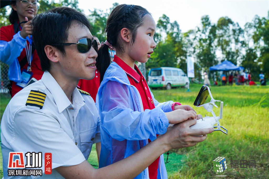 無人機飛行課程,小朋友在飛手的指導下學習操作無人機。