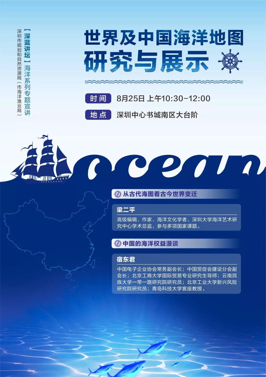 麥哲倫完成了第一次環(huán)球航行、哥倫布發(fā)現(xiàn)了新大陸、迪亞士最早探險(xiǎn)至非洲最南端好望角、達(dá)伽馬開辟了通往印度的新航線…… 2000多年前,在茫茫大海上 裝備簡陋的航海者 取暖靠抖、通訊靠吼 沒有網(wǎng)絡(luò)、沒有手機(jī)、沒有GPS …… 卻能在廣闊無邊的大海中 找到心之所向的目的地 這是因?yàn)?/p> 他們有一張神奇的圖——海圖 梁二平:從古代海圖看古今世界變遷 世界上這一次又一次的航海大發(fā)現(xiàn),或者是由黃金、白銀、香料、瓷器、黑奴貿(mào)易等所引發(fā)的大侵略、大移民、大變革,都在一張小小的圖中展現(xiàn)得淋漓盡致。 大航海時(shí)代早期,西班牙、葡萄牙稱霸海洋,出盡了風(fēng)頭,靠的就是海圖。后來英國擊敗荷蘭,意識(shí)到光靠戰(zhàn)爭是控制不了海洋的,更重要的是海洋知識(shí)。于是,英國設(shè)立了一個(gè)水文部,專門進(jìn)行測量和制作海圖。這便是一代“海上霸主”崛起的關(guān)鍵。 每一幅海圖 都承載著豐富的地理、社會(huì)及歷史信息 不同時(shí)代、地域,不同文化背景下的海圖繪制者 對空間有著不同的理解 描繪世界的方式也有所不同 海圖一步一步從文字描述到精確標(biāo)注 東西方海圖相互交融發(fā)展 為海洋變遷提供了真實(shí)的見證 一張小小的海圖 卻扮演著舉足輕重的“角色” 其實(shí),它也和海洋權(quán)益 也有著密不可分的關(guān)系 宿東君:中國的海洋權(quán)益漫談 談及主權(quán)問題 我們總是滿懷著一腔熱血 看紀(jì)錄片時(shí) 海上時(shí)不時(shí)會(huì)漂浮著一個(gè)個(gè)小浮標(biāo) 想知道小浮標(biāo)對海洋科技考察有什么作用? 中國先驅(qū)又是如何歷盡艱難險(xiǎn)阻 主張屬于中國的海洋權(quán)益的? 想知道引發(fā) 南海問題、釣魚島問題的“來龍去脈”嗎? 以上的種種疑問 都將在8月25日的“”深藍(lán)講壇” 一同為你揭曉! “深藍(lán)講壇” 2017年5月,《全國海洋經(jīng)濟(jì)發(fā)展“十三五”規(guī)劃》明確提出推進(jìn)深圳建設(shè)全球海洋中心城市,在投融資、服務(wù)貿(mào)易、商務(wù)旅游等方面進(jìn)一步提升對外開放水平和國際影響力,打造成為“21世紀(jì)海上絲綢之路”的排頭兵和主力軍;2018年9月,市委市政府印發(fā)《關(guān)于勇當(dāng)海洋強(qiáng)國尖兵加快建設(shè)全球海洋中心城市的決定》及實(shí)施方案;2019年,深圳創(chuàng)建全球海洋中心城市納入到《粵港澳大灣區(qū)規(guī)劃發(fā)展綱要》和《關(guān)于支持深圳建設(shè)中國特色社會(huì)主義先行示范區(qū)的意見》。 為讓社會(huì)了解這一重要政策,計(jì)劃通過開展“深藍(lán)講壇”專題系列活動(dòng),通過專家講授、市民互動(dòng)等活動(dòng),請市民對我市海洋發(fā)展政策、主要目標(biāo)和實(shí)施路徑等建言獻(xiàn)策,在擴(kuò)大影響面的同時(shí)收集好的意見和建議,以更好地推動(dòng)我市海洋各項(xiàng)工作的順利開展,為我市創(chuàng)建全球海洋中心城市營造氛圍,奠定思想基礎(chǔ)。 現(xiàn)在,“深藍(lán)講壇”專題系列活動(dòng)真的來了! 8月25日 以“世界及中國海洋地圖研究與展示”為主題 2019年首場“深藍(lán)講壇”海洋系列專題宣講活動(dòng) 即將拉開帷幕