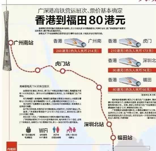 廣深港高鐵香港段,從香港西九龍總站發(fā)車,到深圳福田站、深圳北站、虎門站和廣州南站票價(jià)基本確定為80港元、90港元、210港元和260港元。