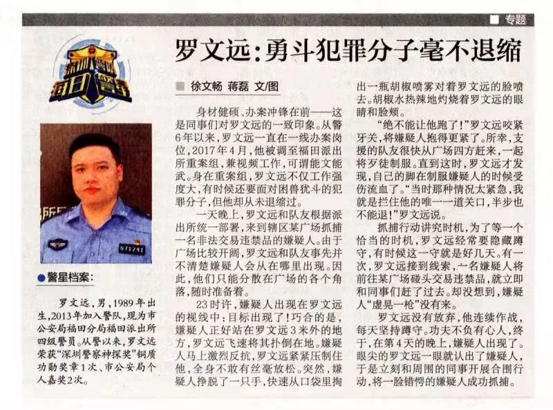 羅文遠,男,1989年出生,2013年加入警隊,現(xiàn)為深圳市公安局福田分局福田派出所四級警員。從警以來,羅文遠榮獲“深圳警察神探獎”銅質(zhì)功勛獎?wù)?次、市公安局個人嘉獎2次。