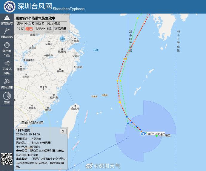 預計“塔巴”將以每小時10公里左右的速度緩慢向西北方向移動,強度逐漸加強,后期逐漸轉(zhuǎn)趨朝鮮半島南部海域,對深圳無直接風雨影響。