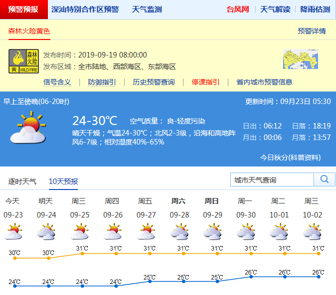 見圳客戶端·深圳新聞網(wǎng)2019年9月23日訊 深圳市氣象局今天晴天干燥;氣溫24-30℃;北風(fēng)3級,陣風(fēng)8級;相對濕度40%-65%。預(yù)計24-27日多云間晴天為主,濕度略有增加,部分時間有短時陣雨。