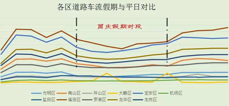 市內(nèi)交通除大鵬和鹽田區(qū)較平日有所上升外,其余各區(qū)均較平日車流減少30%左右。假日期間車流將集中在非上下班高峰的時間段。