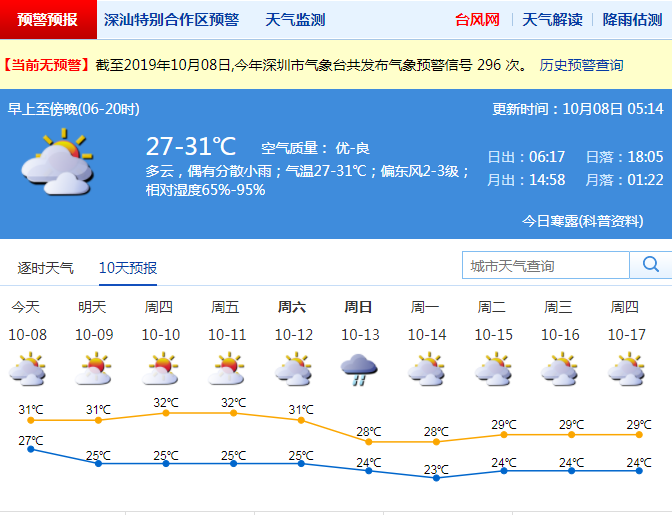 見圳客戶端·深圳新聞網2019年10月08日訊 據深圳市氣象局消息,今天深圳多云,偶有分散小雨;氣溫27-31℃;偏東風2-3級;相對濕度65%-95%。