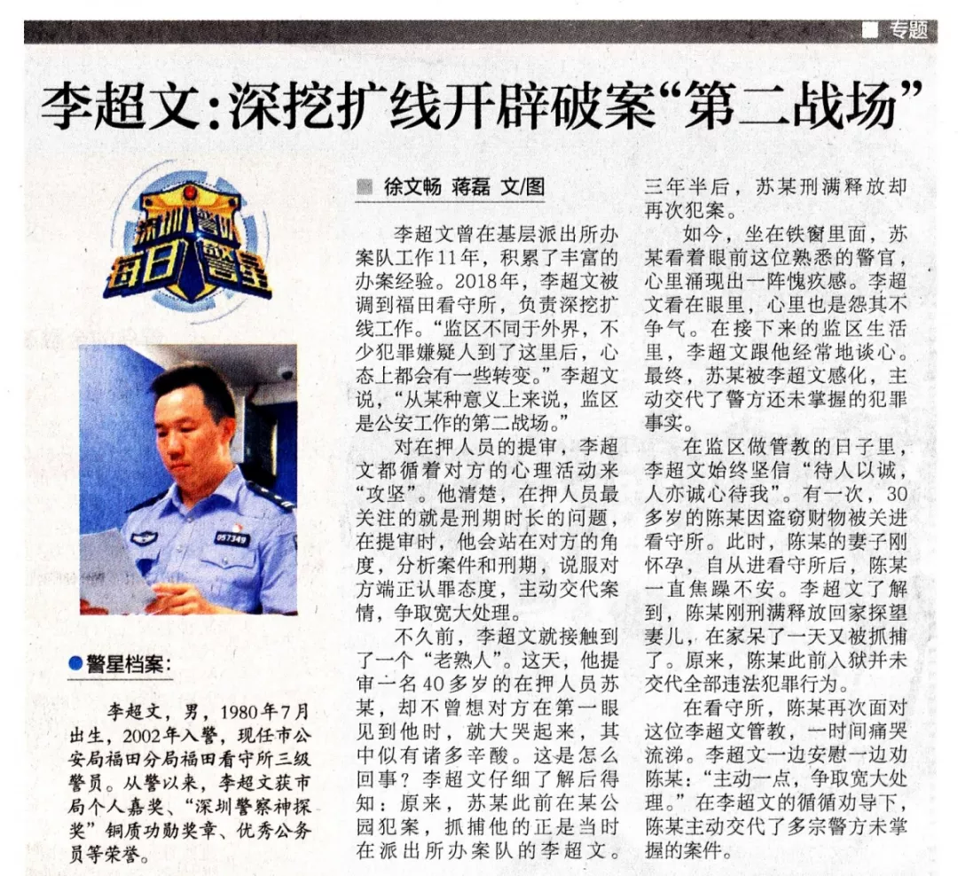 李超文曾在基層派出所辦案隊工作11年,積累了豐富的辦案經(jīng)驗。2018年,李超文被調(diào)到福田看守所,負責深挖擴線工作?!氨O(jiān)區(qū)不同于外界,不少犯罪嫌疑人到了這里后,心態(tài)上都會有一些轉(zhuǎn)變?!崩畛恼f,“從某種意義上來說,監(jiān)區(qū)是公安工作的第二戰(zhàn)場。”