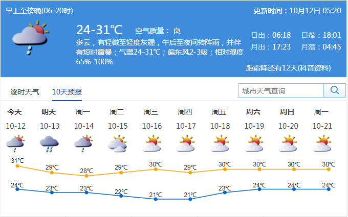 見圳客戶端·深圳新聞網(wǎng)2019年10月12日訊 據(jù)深圳市氣象臺消息,今日深圳多云,有輕微至輕度灰霾,午后至夜間轉(zhuǎn)陣雨,并伴有短時雷暴;氣溫24-31℃;偏東風2-3級;相對濕度65%-100%