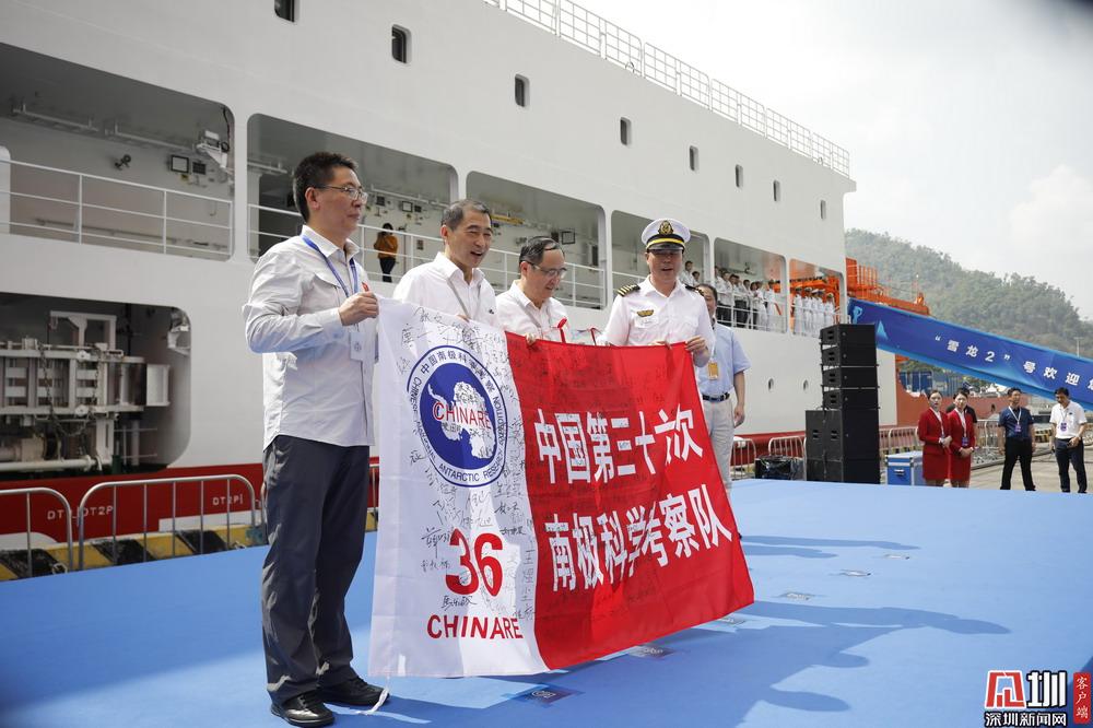 在活動現(xiàn)場,南極科考隊(duì)向深圳市人民政府贈送了比例1:100“雪龍2”號船船模紀(jì)念品,隨后,南極科考隊(duì)向招商局集團(tuán)贈送全體科考隊(duì)員簽名的隊(duì)旗等。此外,黃敏副市長率隊(duì)登船參觀、慰問考察隊(duì)員,并與考察隊(duì)員親切交流座談。