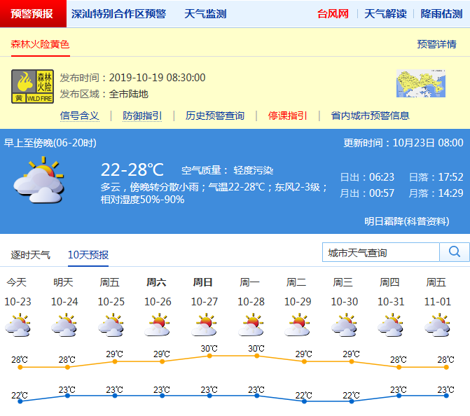 見圳客戶端·深圳新聞網(wǎng)2019年10月23日訊 近期深圳天氣持續(xù)干燥。深圳市氣象臺預(yù)計(jì),23-24日云量增多有分散小雨:23日云量增多,有分散小雨,24日分散小雨轉(zhuǎn)多云,最低氣溫21-22℃、最高氣溫27-28℃;25-29日多云到晴,空氣干燥。