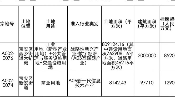 根據(jù)公告,深圳市土地房產(chǎn)交易中心受深圳市規(guī)劃和自然資源局寶安管理局委托,擬出讓寶安區(qū)西鄉(xiāng)街道大鏟灣A002-0076和寶安區(qū)新安街道A002-0074兩宗地。掛牌期自2019年11月20日至2019年11月29日15時止。(見圖表)