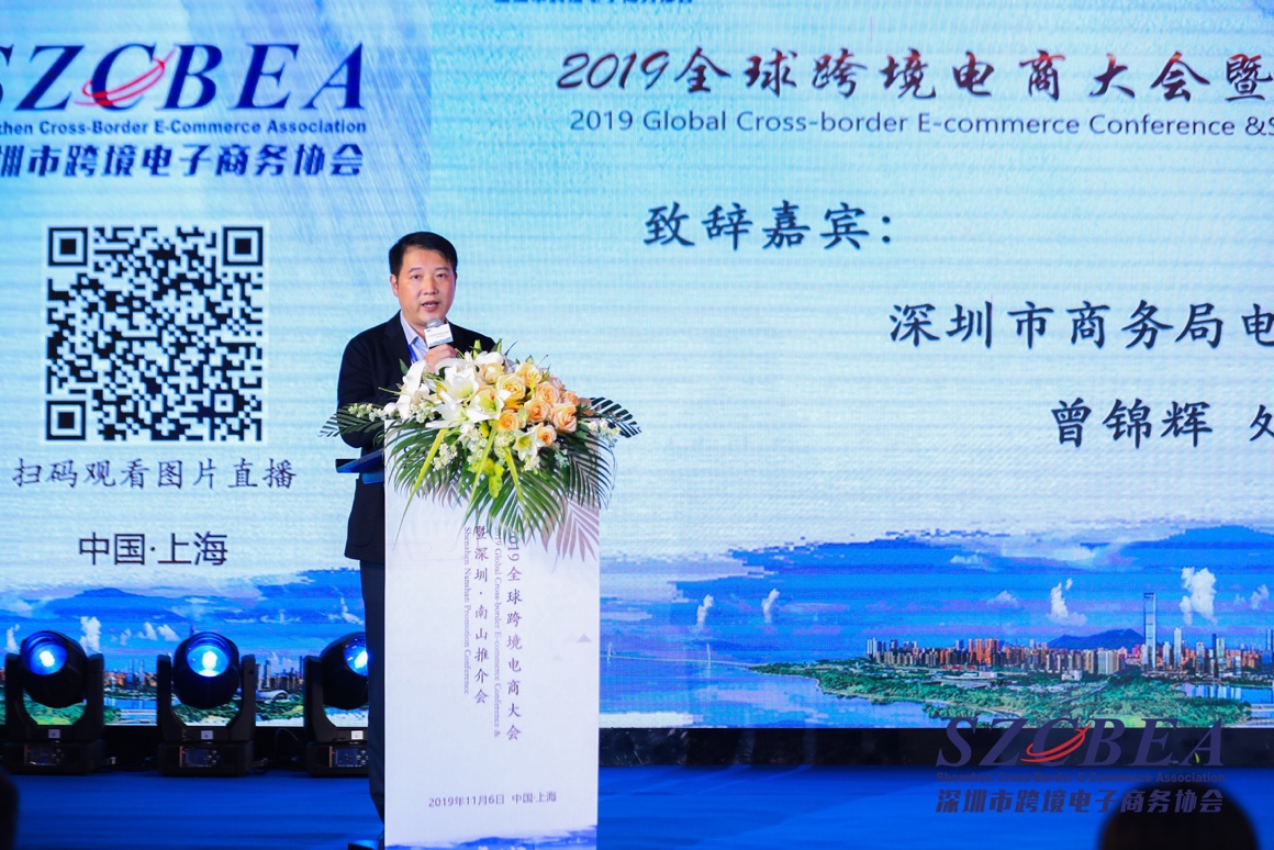 深圳市商務(wù)局商務(wù)處處長曾錦輝致開場辭。2018年深圳跨境電商交易額達603.3億美元(約合人民幣3992.3億元),同比增長20.3%??缇畴娚痰某掷m(xù)高速增長在推動深圳傳統(tǒng)外貿(mào)模式的變革、確立國際貿(mào)易地位上有著突出作用。曾錦輝表示:“深圳市商務(wù)局將繼續(xù)在理論研究、對外交流合作和模式創(chuàng)新實踐上對全國跨境電商的發(fā)展給予鼎力支持。”