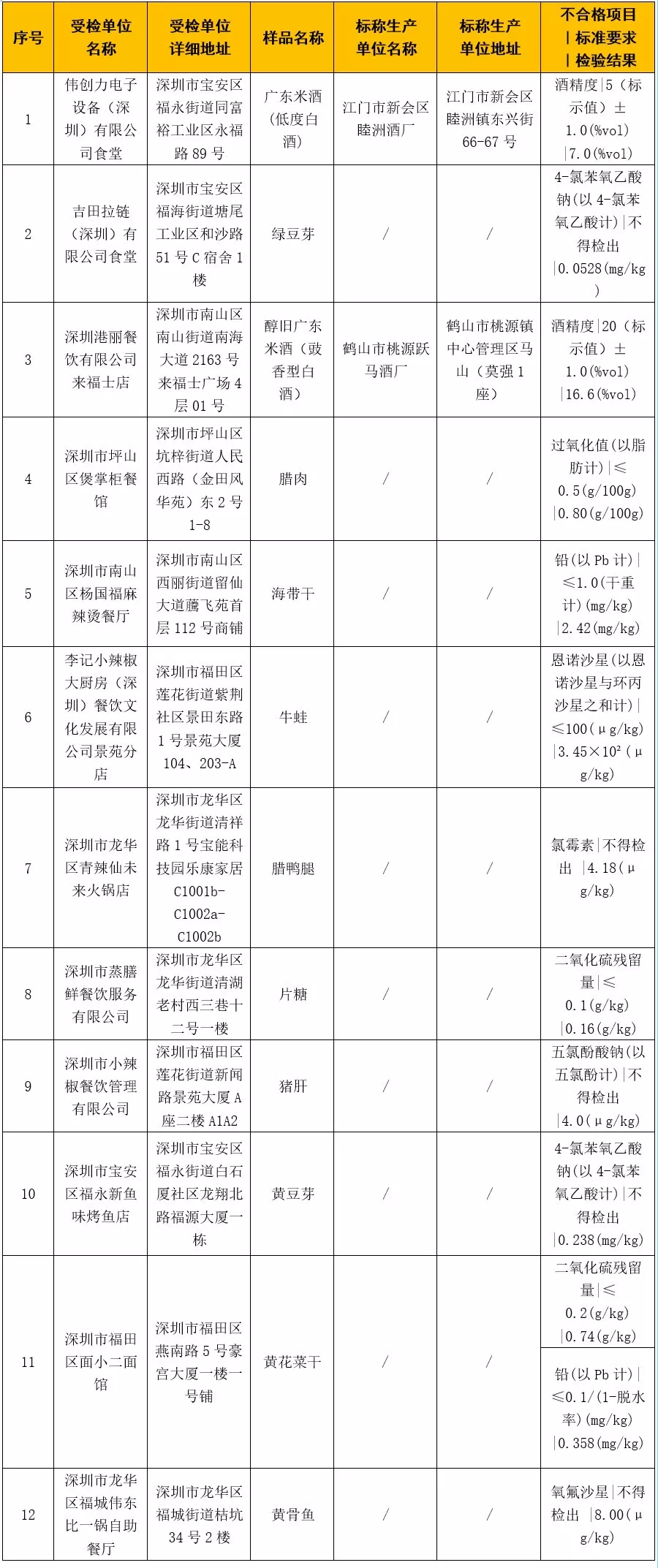 本次共抽檢餐飲環(huán)節(jié)食品671批次,涉及餐飲環(huán)節(jié)經(jīng)營(yíng)主體584家次,共檢測(cè)食品指標(biāo)3385項(xiàng)次。其中檢出不合格樣品12批次,涉及不合格食品類別有酒類2批次、肉制品2批次、食糖1批次、食用農(nóng)產(chǎn)品5批次、蔬菜制品1批次、水產(chǎn)制品1批次;涉及不合格項(xiàng)目類別為品質(zhì)指標(biāo)、食品添加劑、獸藥殘留、農(nóng)藥殘留、非食用物質(zhì)、金屬等元素污染物。