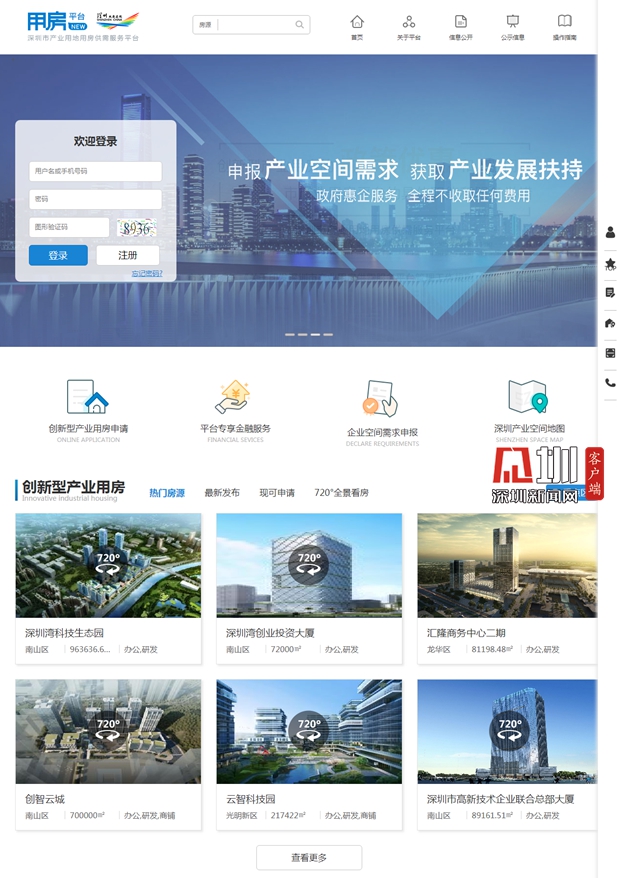 記者在平臺(tái)官網(wǎng)看到,平臺(tái)不僅提供創(chuàng)新型產(chǎn)業(yè)用房申請(qǐng)入口、平臺(tái)專享金融服務(wù)、企業(yè)空間需求申報(bào),還設(shè)有深圳產(chǎn)業(yè)空間地圖、720度全景看房,頁(yè)面簡(jiǎn)潔直觀。