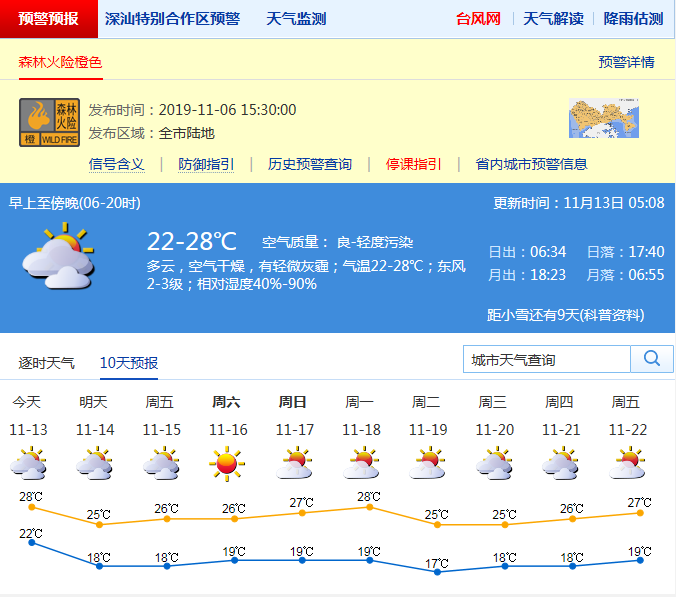 但,據(jù)深圳市氣象局消息,13日多云,早晚清涼,氣溫21-28℃,部分時段有輕微灰霾。13日夜間-14日受冷空氣影響,氣溫下降2-3℃,北風(fēng)加大,沿海、高地和海區(qū)最大陣風(fēng)7級左右。15-17日晴天干燥,風(fēng)力減弱。18日-19日受新一股冷空氣影響,北風(fēng)再次加大,氣溫明顯下降,深圳有望入秋。