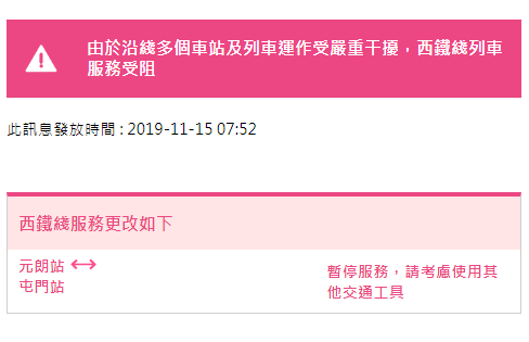 07:52,西鐵線服務(wù)更改為:元朗站往返屯門(mén)站暫停服務(wù)。