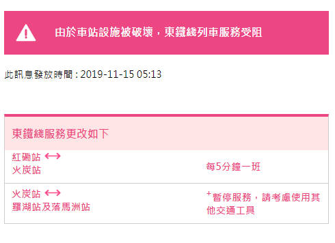 至05:13,港鐵更新信息,由于車(chē)站設(shè)施被破壞,東鐵線列車(chē)受阻,服務(wù)安排更改為:火炭到紅磡每5分鐘一班,火炭站至羅湖及落馬洲站暫停服務(wù)。