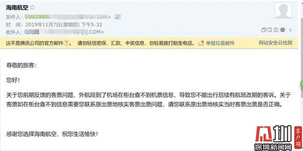 海航方面回復葉先生郵件截圖(圖片由葉先生提供)