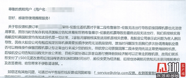 近日,葉先生向深圳新聞網(wǎng)記者爆料稱,他于今年8月份通過攜程網(wǎng)購買國慶期間深圳往返倫敦的機票,但轉(zhuǎn)機時卻因查不到登機信息導致滯留機場,又因航司規(guī)定被剝奪返程機票的使用權(quán)。事后,葉先生反復與平臺及航司溝通要求說明事件原因并要求賠償,但目前事件尚未完全解決。