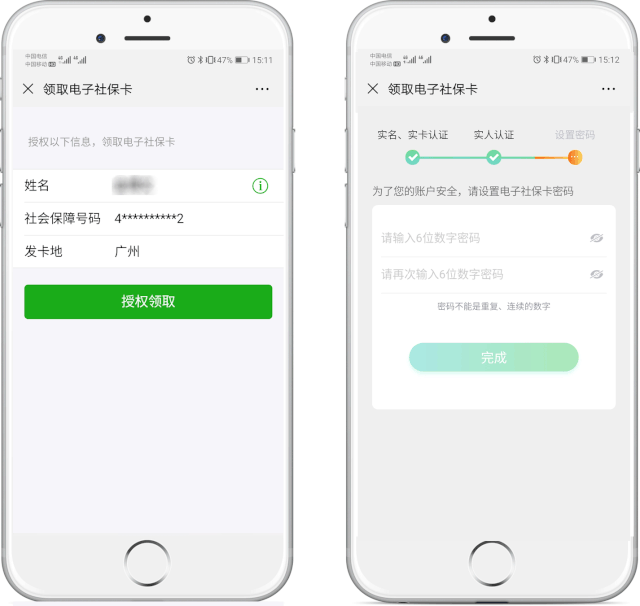 根據(jù)提示授權領取電子社???,并進行實人實名認證后,設置電子社??艽a,即可完成領取。