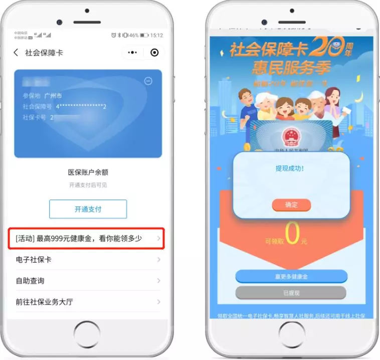 綁定電子社保卡后,可通過(guò)社??ㄔ斍轫?yè),回到活動(dòng)首頁(yè),點(diǎn)擊“提現(xiàn)到零錢(qián)”,馬上提現(xiàn)。