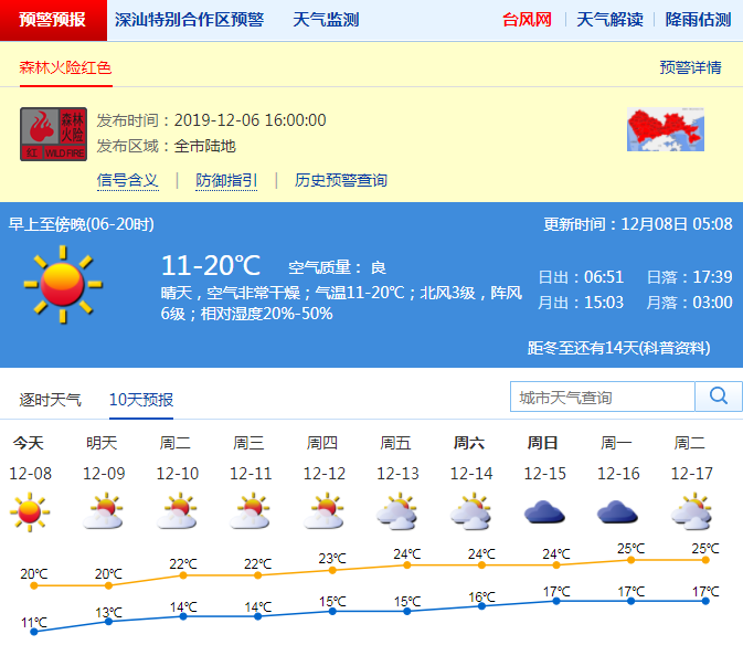 深圳市氣象局預(yù)計8日晴天間多云,空氣非常干燥;氣溫10-20℃;偏北風3-4級;相對濕度20%-50%。9-11日晴天間多云,空氣非常干燥,氣溫逐日回升,12-13日多云,晝夜溫差減小。