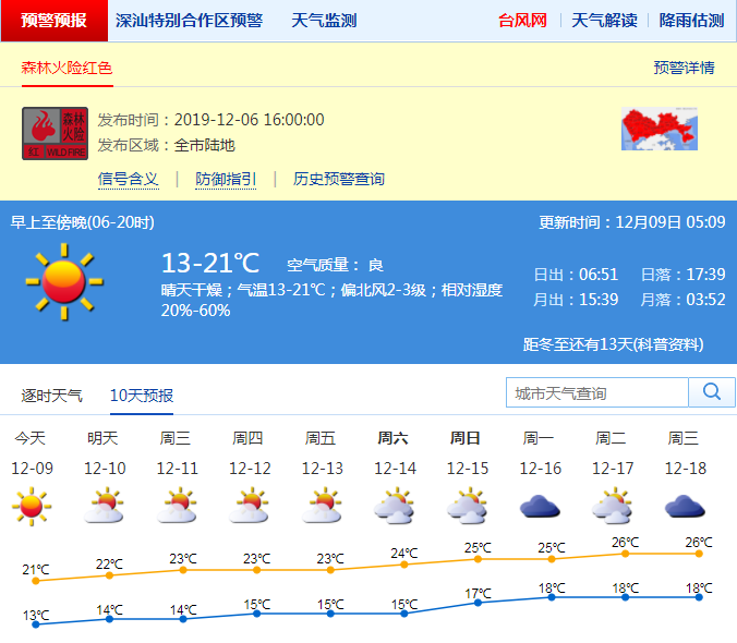 見圳客戶端·深圳新聞網(wǎng)2019年12月9日訊 連日來的降溫,讓許多市民懷疑“深圳難道入冬啦?”周末早晨,全市最低氣溫只有10-12℃??諝夥浅8稍?,深圳市森林火險(xiǎn)紅色預(yù)警、深汕區(qū)森林火險(xiǎn)黃色預(yù)警及寒冷黃色預(yù)警信號(hào)生效中。