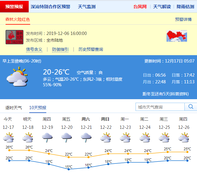 見(jiàn)圳客戶端·深圳新聞網(wǎng)2019年12月17日訊 深圳市氣象局預(yù)計(jì)17-18日多云,早晚有輕霧,天氣溫暖;19-21日受冷空氣影響,陰天間多云,有分散小雨,氣溫下降,天氣明顯轉(zhuǎn)涼。22日多云,氣溫回升。17-18日早晚有輕霧,注意交通安全。
