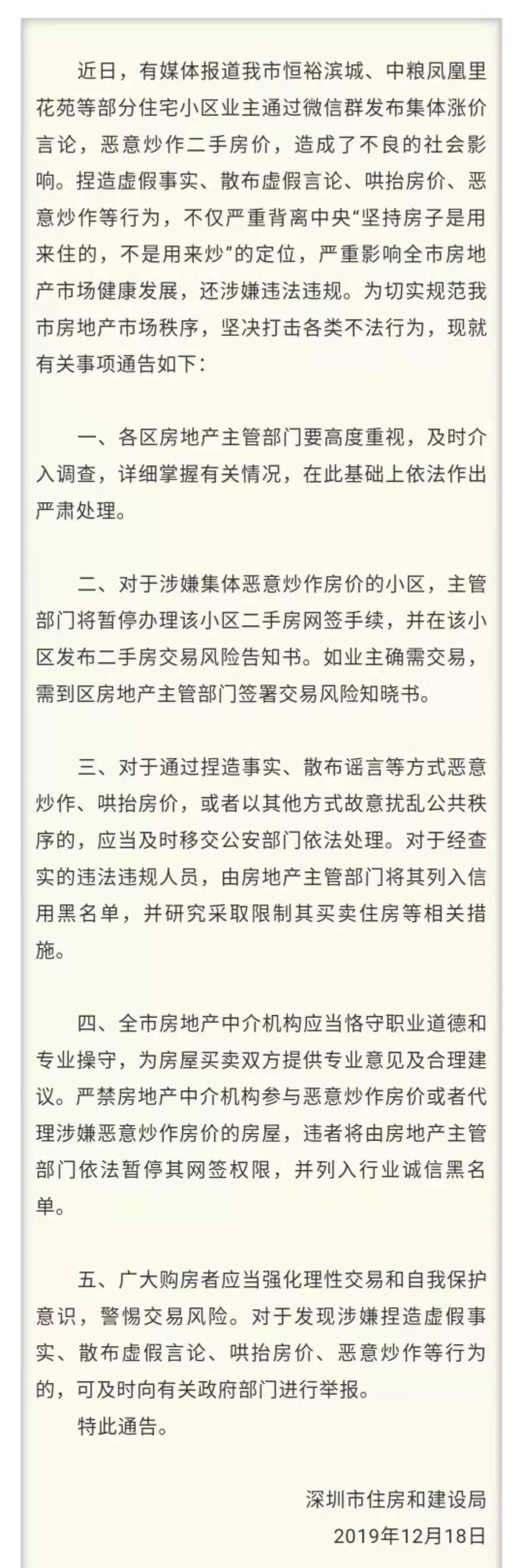 12月18號深圳市住建局發(fā)布通稿稱嚴(yán)厲打擊哄抬房價等違規(guī)行為