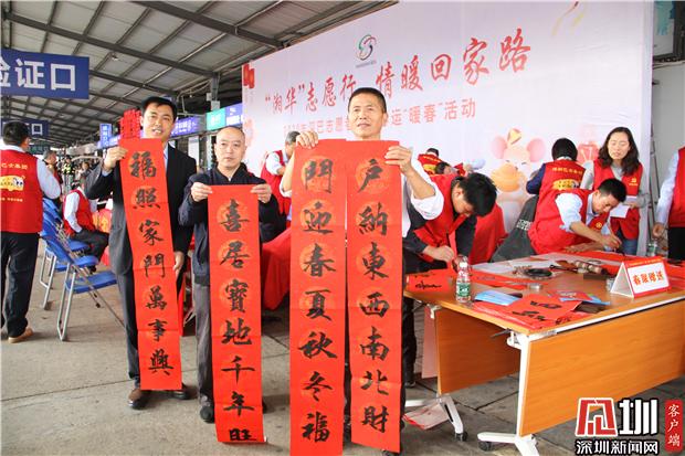 深圳巴士集團(tuán)志愿者現(xiàn)場(chǎng)寫(xiě)春聯(lián)贈(zèng)給返鄉(xiāng)旅客。