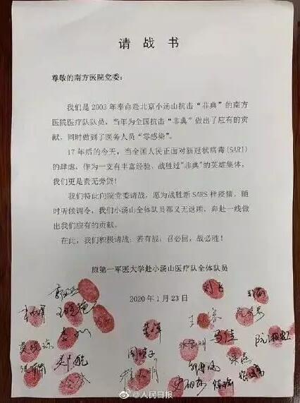 請戰(zhàn)的人員中,有十多年前曾遠(yuǎn)赴小湯山抗擊“非典”的隊(duì)員,有其他在職的醫(yī)生和護(hù)理工作者,還有表示“若有戰(zhàn),召必回!不計(jì)報(bào)酬,無論生死”的離退休老干部群體。一封寫滿簽名并按滿紅手印的“請戰(zhàn)書”,就像跳動著一顆顆紅心的畫卷,引發(fā)網(wǎng)友紛紛感動留言。