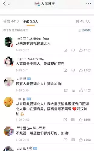 “可能的話,在你們小區(qū)群里為他們加油鼓勁”,這是通告最后一段對居民提出的建議,簡單卻溫馨?;厮葭娔仙皆菏刻岢鲂滦凸跔畈《靖腥镜姆窝状嬖谌藗魅爽F(xiàn)象的這幾天,全國人民在調侃著“躺在家里也可以給國家做貢獻”中度過了別樣的春節(jié),也在網上關注著湖北乃至全國的疫情信息。每天都在增加的確診病例和疑似病例將疫情陰影無限擴大,在外的湖北人也在被歧視的情緒中沉溺,此時深圳小區(qū)這飽含溫情的通告,如一池溫水,暖和了冬日里的人心。