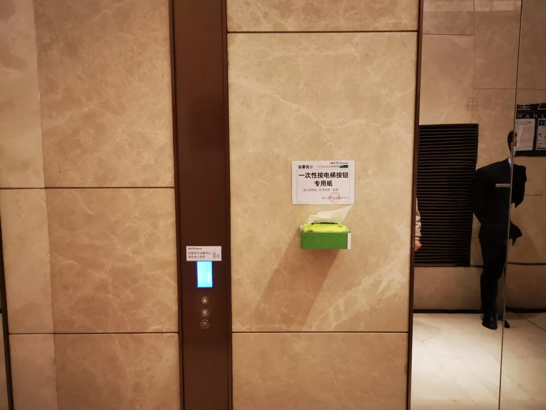 考慮到防控形勢需要,中心對電梯間及按鈕每天至少不低于2次消毒、且每天更換保鮮貼膜外,又于31日在各個電梯廳增設(shè)了一次性抽紙,供乘坐電梯按電梯按鈕時取用。(注:部分樓棟、明天陸續(xù)增設(shè)到位)