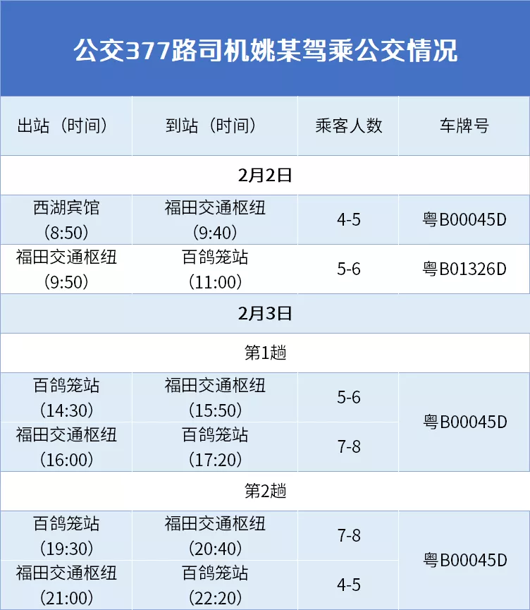 2月3日,姚某經過崗前體溫檢測正常后,分別于14時30分至17時20分(粵B00045D)、19時30分至22時20分(粵B00045D)駕車往返白鴿籠站至福田交通樞紐兩趟,乘客共27名。期間車載視頻確認姚某佩戴口罩、車輛有出站前后消殺記錄、運行途中開窗通風。當晚22:20下班回家后,姚某接江西老家告知,其在老家接觸過的堂弟已確診感染新冠病毒。