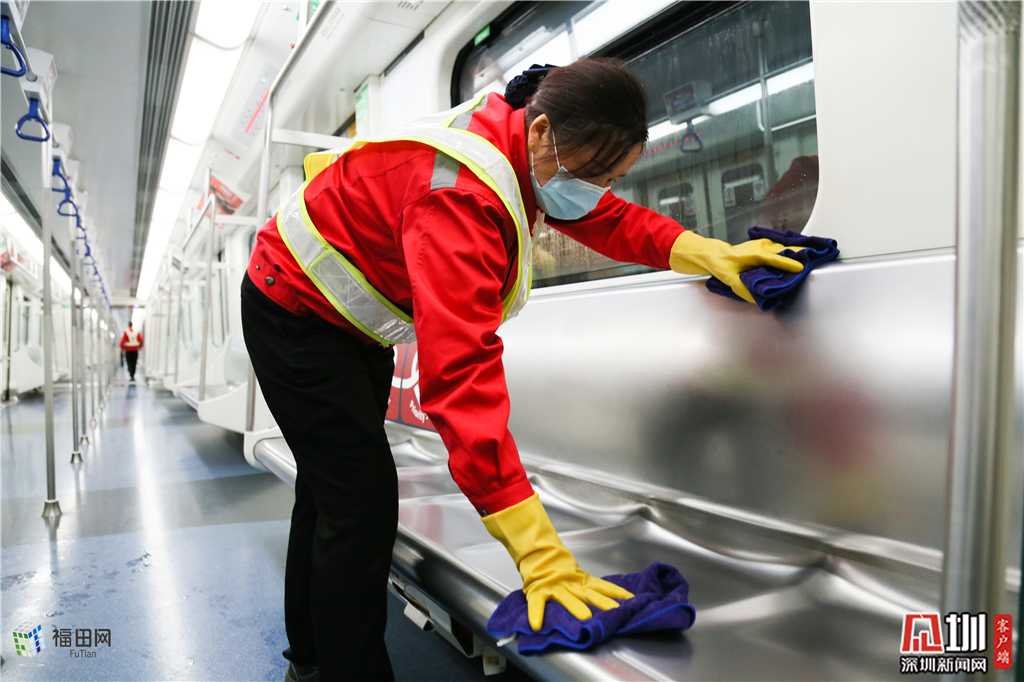 張軍香用剛剛兌好84消毒液,細心地為奔跑一天的列車消殺除菌。這段時間的23點-次日的7點,早上從這個區(qū)域車間駛出的第一批次列車就是保潔員張軍香所在團隊消殺清潔過的。16瓶高濃度的84消毒液,勾兌出近600斤消毒水,6個人分三組,140米的車廂,這段時間的每個夜晚,在這座城市最重要的交通工具上默默耕耘。