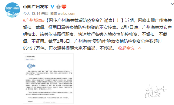 2月7日晚,廣州海關(guān)發(fā)布聲明稱,網(wǎng)絡(luò)“廣州海關(guān)暫扣、截留、征用口罩等疫情防控物資”為不實(shí)傳言。目前,廣州海關(guān)依法履行職責(zé),快速放行各類入境疫情防控物資,不暫扣、不截留、不征用。截至2月6日,廣州海關(guān)“零延時(shí)”驗(yàn)放疫情防控物資總件數(shù)超過(guò)6319.7萬(wàn)件。上海、天津、寧波、大連、鄭州等地海關(guān)也紛紛辟謠,表示不會(huì)征用個(gè)人口罩。