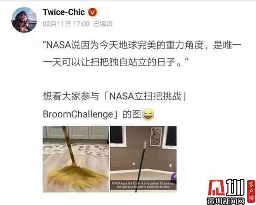 見圳客戶端·深圳新聞網(wǎng)2020年2月11日訊 (見圳客戶端、深圳新聞網(wǎng)記者 吳英敏)2月11日,有網(wǎng)友在微博曬出兩張掃把直立的照片:“宅在家里試了一下NASA立掃把挑戰(zhàn),據(jù)說一年中只有今天可以立起來,親測有效!”記者也在朋友圈發(fā)現(xiàn)許多朋友紛紛曬出掃把直立成功的圖片,有網(wǎng)友稱,“宅家立掃把”將全國人民心相連了!隨后,人民日報微博辟謠稱,真相是,掃帚能立起來與今天的引力無關(guān),每天都可以立,只要你能找到平衡!