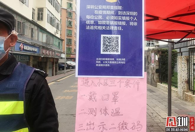 在沙頭角保稅區(qū)第一生活區(qū)原為開放式小區(qū),記者發(fā)現(xiàn),疫情期間,該小區(qū)只保留一個出入口,并在出入口設(shè)置了疫情監(jiān)測點,并明確張貼了標(biāo)有進出小區(qū)條件的宣傳語:戴口罩、測體溫、出示二維碼。記者向執(zhí)勤人員表示:“我不在這個小區(qū)居住,但需要到超市買點東西,可以進嗎?”執(zhí)勤人員告訴記者,只要戴好口罩,體溫監(jiān)測正常,出示登記過身份的二維碼就可以進去。