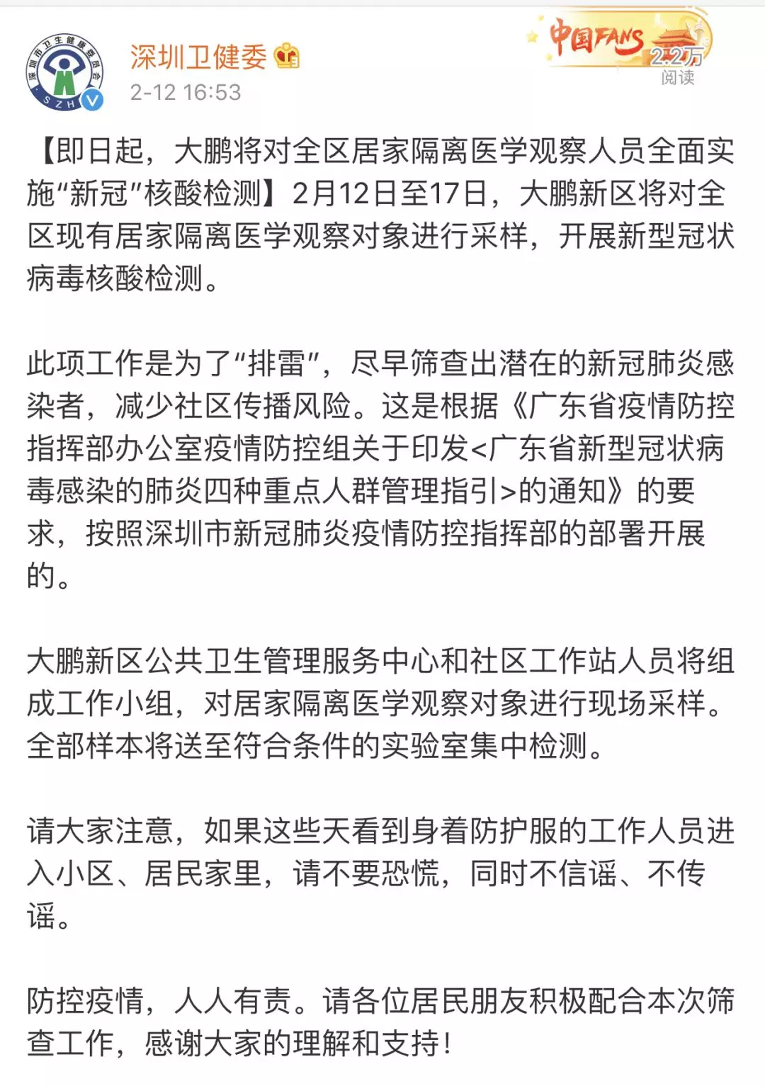 徹底“排雷”!深圳免費為所有居家隔離者檢測“新冠”病毒核酸