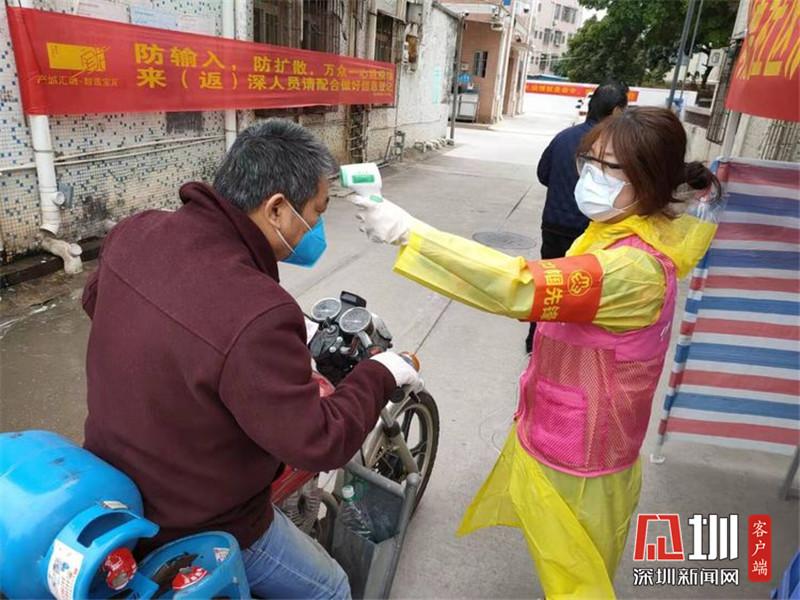 來(lái)自龍崗區(qū)南嶺村的鄧育芳,是不少租戶的房東,也是值守在南嶺南路黨員先鋒崗的一名村民志愿者。連續(xù)十多天,她每天在村口站立整整7個(gè)小時(shí),不停為出入居民測(cè)量體溫、詢問(wèn)來(lái)源地、查驗(yàn)申報(bào)二維碼、引導(dǎo)注冊(cè)。