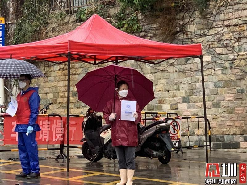 志愿者羅秀蘭冒雨堅(jiān)守在崗位上