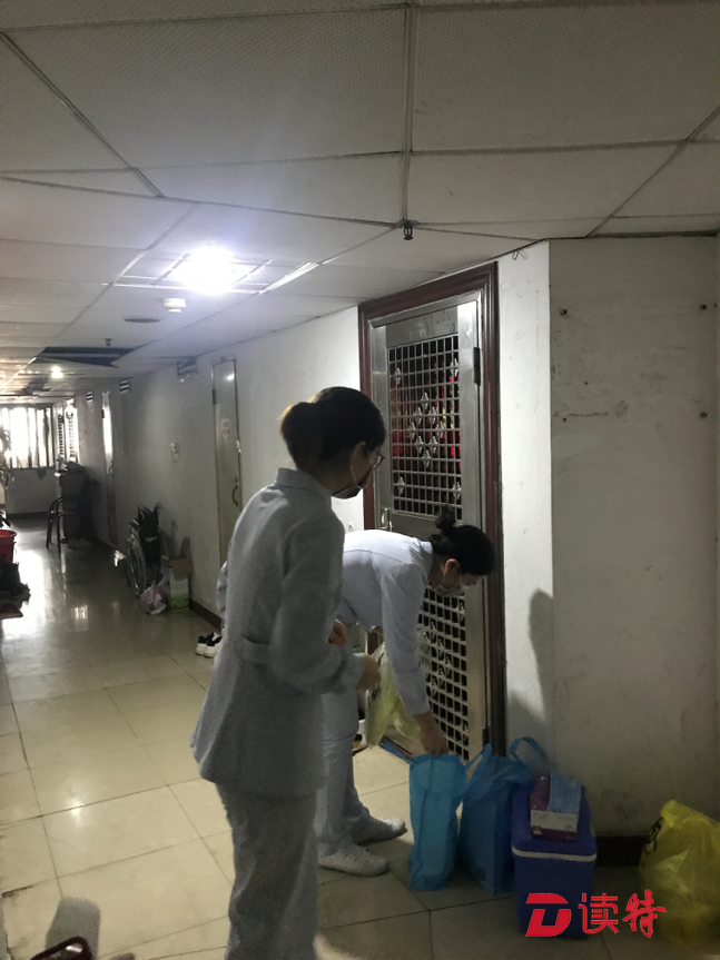孫女士打開(kāi)門,將工作人員遞進(jìn)去的防護(hù)裝備穿戴完畢?!盀榱吮Wo(hù)醫(yī)護(hù)人員的安全,減少交叉感染的可能性,所有的上門檢測(cè)都會(huì)在樓道里進(jìn)行?!鄙缈抵行墓ぷ魅藛T說(shuō)。提前穿好防隔服等防護(hù)裝備、拿檢測(cè)時(shí)給居民坐的凳子、為凳子消毒,開(kāi)始進(jìn)行檢測(cè)前就需要做很細(xì)致的準(zhǔn)備工作。