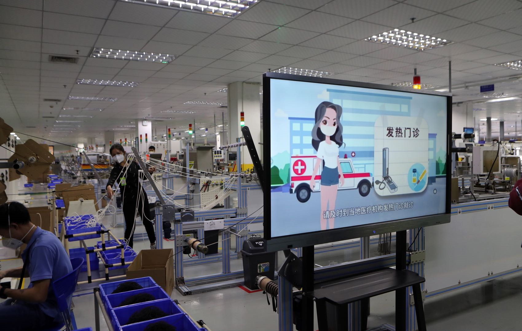 在工作車間,記者看到,每一位員工都背對(duì)背而坐,且員工之間保持著大約1.5米的距離,并被擋板完全隔開。