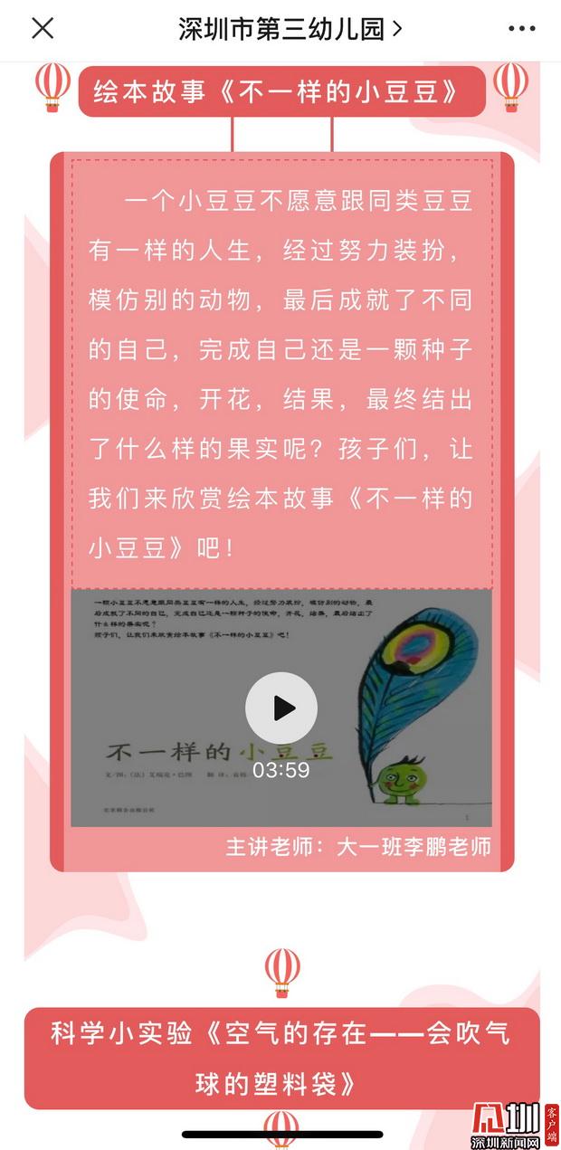 深圳市第三幼兒園園長邱雪華訴記者:“目前,三幼已經(jīng)開啟線上教學活動,我們充分運用公眾號、微信群等網(wǎng)絡平臺,與家長、幼兒充分互動,陸續(xù)推出具有健康促進特色的圖文推送,其中包括介紹防疫常識的攻略、由園長主講的園長電臺,還創(chuàng)辦了每日一期的原創(chuàng)系列游戲,以便家長在家也能獲取適宜的親子游戲活動資源?!庇浾咴谏钲谑械谌變簣@的微信公眾平臺上看到,幼兒園線上互動內(nèi)容豐富,其中包括視頻繪本故事、科學小實驗以及親子體育游戲。每個版塊均由深圳市第三幼兒園老師們主講示范并錄制視頻,便于孩子及家長學習。