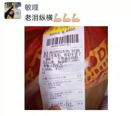1月30日晚上8點56分,華中科技大學(xué)協(xié)和深圳醫(yī)院(南山醫(yī)院)手外科護士王敏在朋友圈曬了一張照片,照片里是一個紅色塑料袋上貼著一張外賣單,備注上寫著,“南山醫(yī)院發(fā)熱門診的醫(yī)務(wù)工作者們,你們辛苦了!請收下一個普通市民的一點點心意,加油,肺炎必??!”