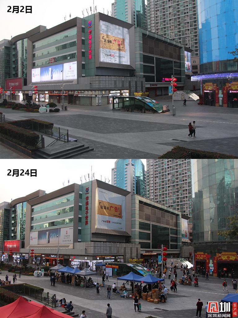 上圖為2月2日,人跡罕見(jiàn)的華強(qiáng)北電子商業(yè)街,下圖為2月24日,華強(qiáng)北電子商業(yè)街人流量已有明顯增多。