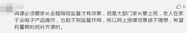 雖然網(wǎng)課兩端是老師和學(xué)生,但家長的參與也必不可少。部分參與者認(rèn)為,如果沒有家長的有效監(jiān)管,網(wǎng)課很難保證教學(xué)質(zhì)量,而大部分家長已經(jīng)復(fù)工,無法時刻盯著孩子。有些家長晚上下班后還要監(jiān)督孩子上網(wǎng)課、做作業(yè),實(shí)在“費(fèi)時、費(fèi)力、費(fèi)神”。讓孩子自己上網(wǎng)課,有些“連作業(yè)是什么都不清楚”。還有些孩子利用上網(wǎng)課的空檔玩游戲,甚至“從十七號開始到現(xiàn)在玩游戲超過1萬塊”。