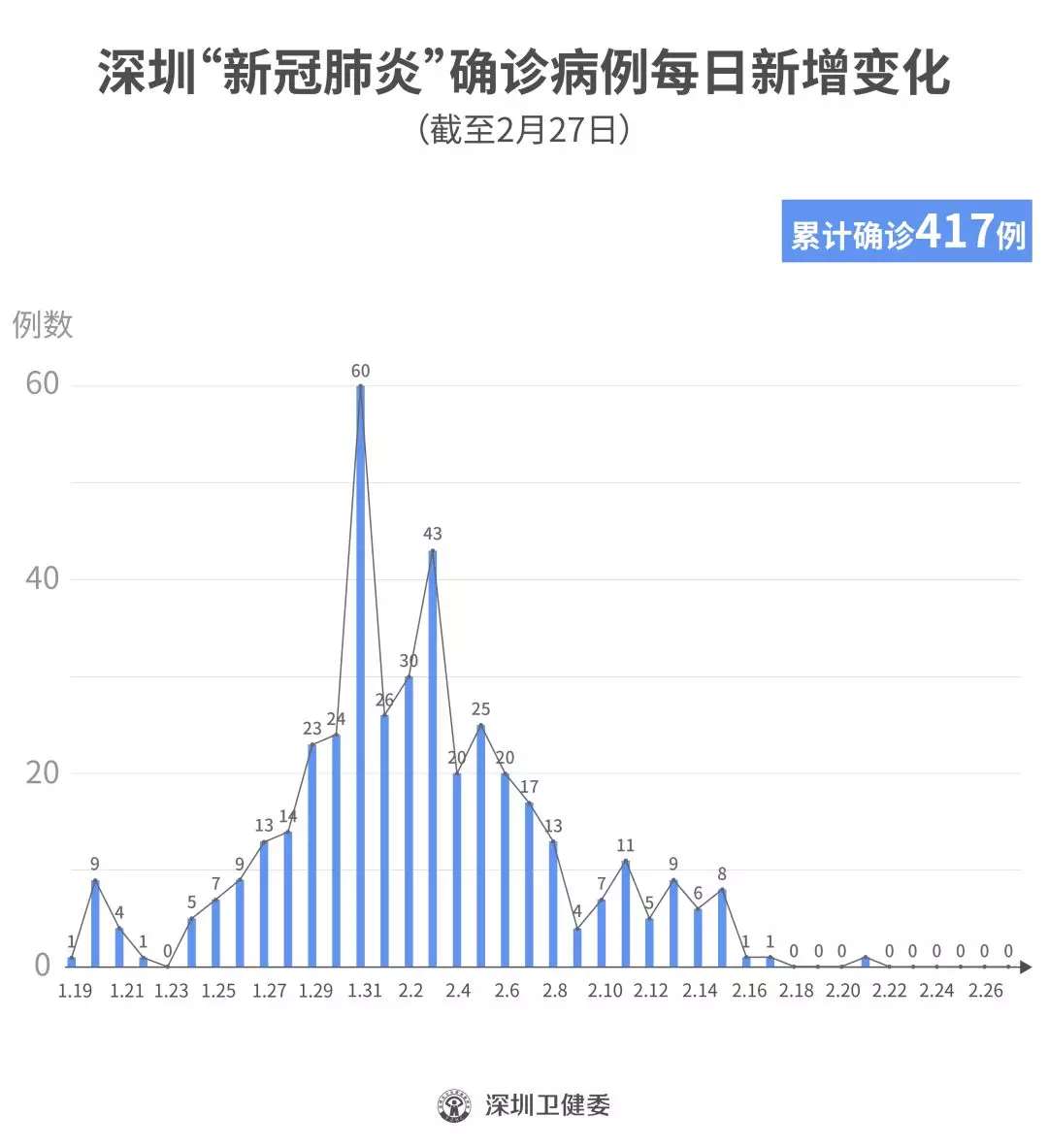 截至2月27日24時(shí),深圳累計(jì)報(bào)告“新冠肺炎”確診病例417例。2月27日當(dāng)天全市無新增確診病例,當(dāng)天出院病例10例(從26日起不再公布出院個(gè)案)。