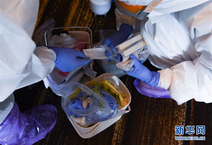2月27日,在深圳龍崗的一家“健康驛站”,工作人員進行咽拭子采集前的準備。 新華社記者 毛思倩 攝