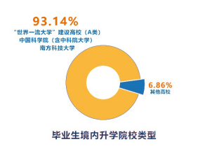 而境內(nèi)升學(xué)中,去往雙一流高校以及中國科學(xué)院(含中科院大學(xué))、南科大的畢業(yè)生占了絕大部分。其中,到清華大學(xué)和北京大學(xué)升學(xué)的共計(jì)13人,7人攻讀碩士學(xué)位,6人攻讀博士學(xué)位。